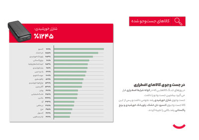 در حوزه تجهیزات و سلامت، رشد جستوجو برای پاوربانک خورشیدی (۷۵۴ درصد)، کیف کمکهای اولیه (۶۵۳ درصد) و نوار تست قند خون (۶۴ درصد) حکایت از دغدغه تأمین نیازهای پزشکی داشت.